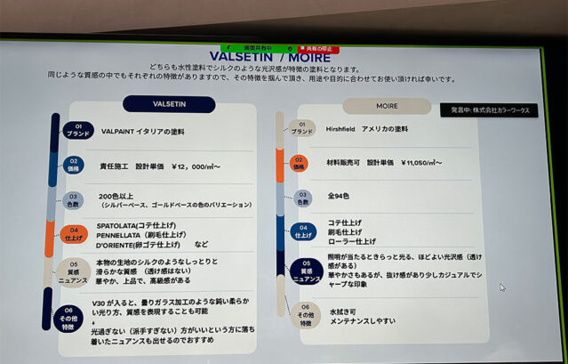 実際の仕上げを塗板サンプルでもご覧いただき、塗料のビフォアアフターをリアルに体感していただくことができました。