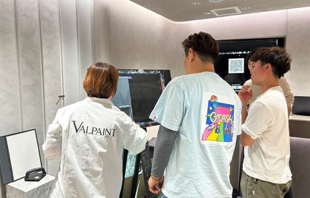 開催直後は、実際にショールームに足を運んでくれた職人の方に塗料を実際に触っていただきました。