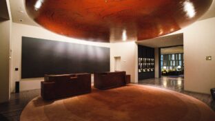 いちご本郷三丁目ビルキラキラと繊細に煌めく天井と、深みのあるゴールドの壁面が織りなす上質な空間。 特殊塗装が、このオフィスのエレベーターホールに格別の印象を与えます。